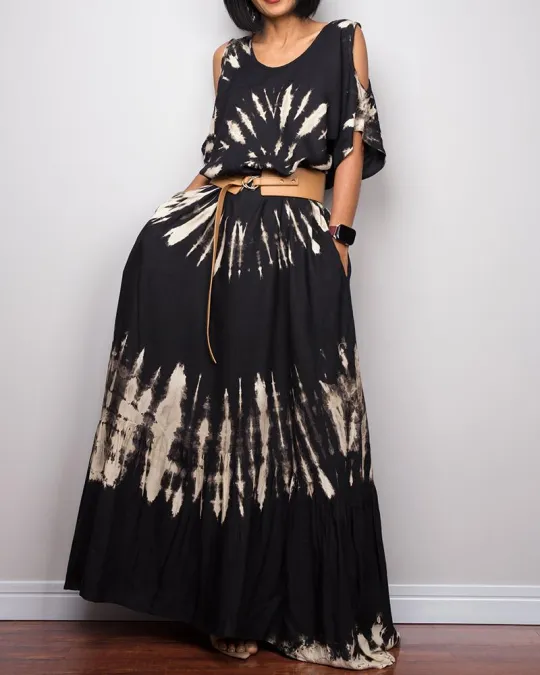 Cold-Shoulder Tie-Dye Print Casual Maxi Dress